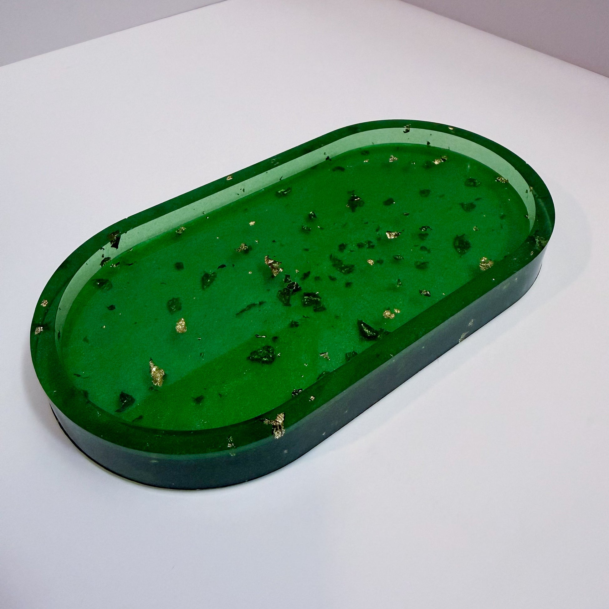 Handcrafted with emerald green resin and golden flakes, this elegant tray is a timeless blend of nature and artistry. Perfect for holding jewelry, keepsakes, or as a decorative accent, each piece is uniquely made to elevate any space.