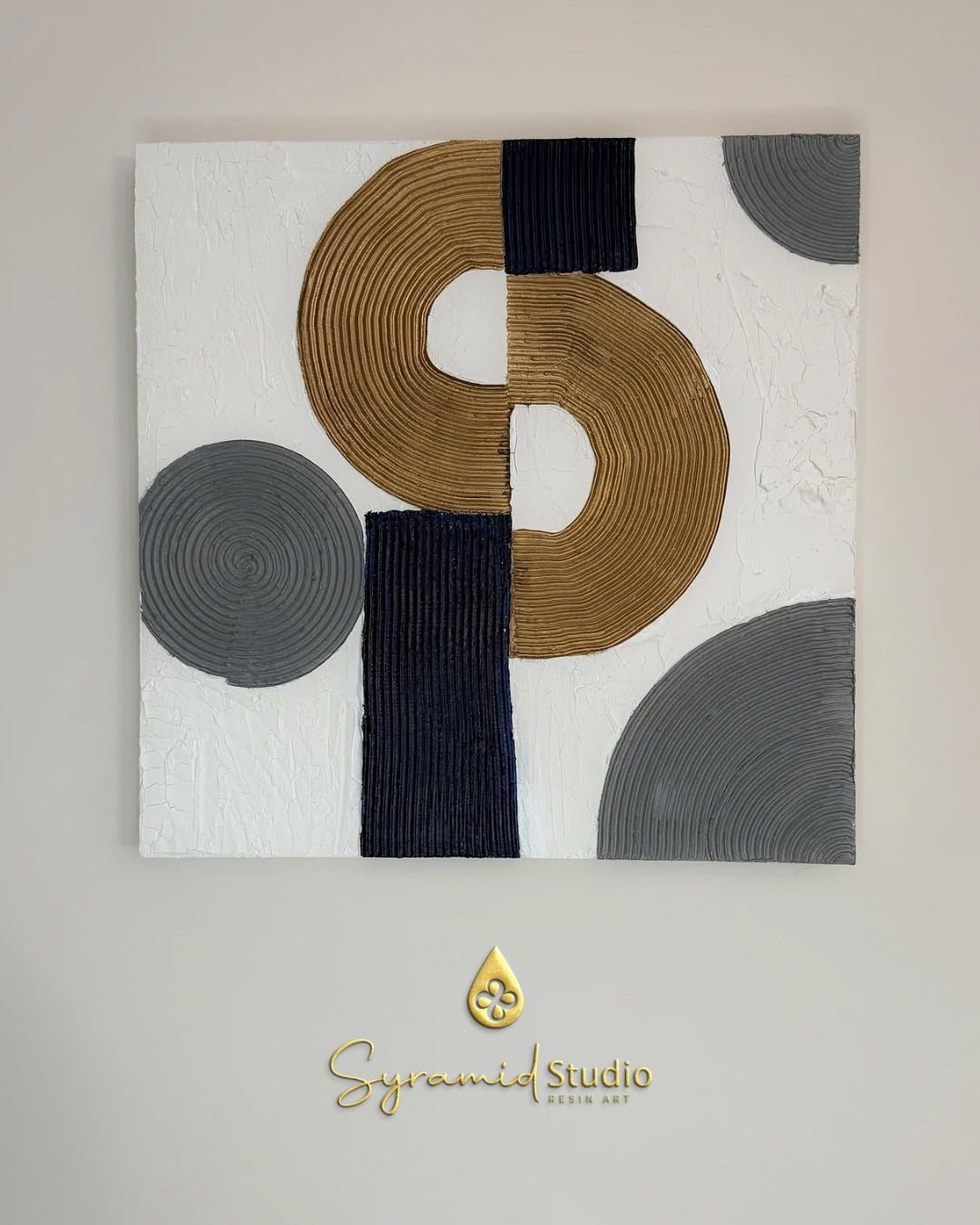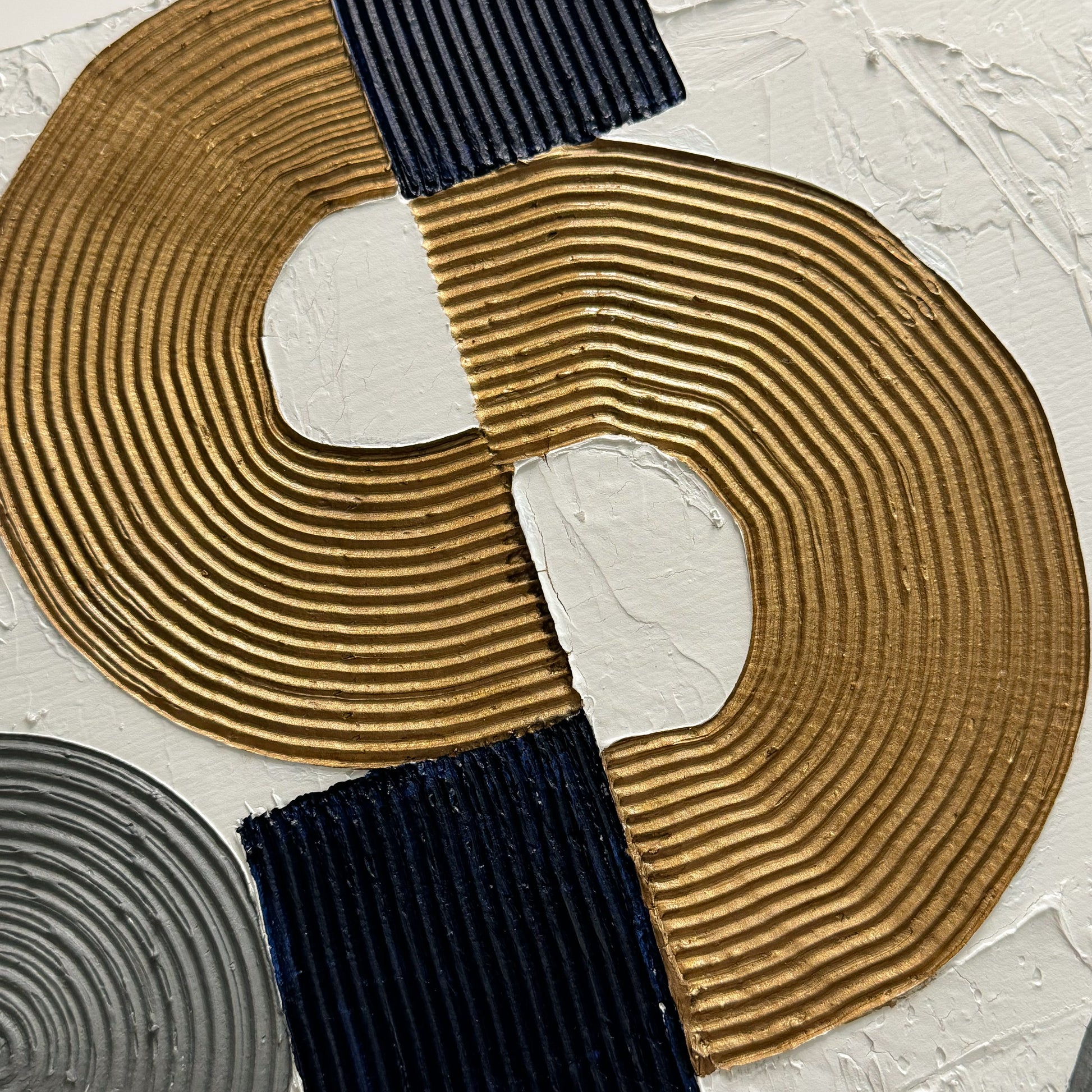 This 12x12 inch wooden canvas features textured paint on a white background, creating a striking contrast with deep blue, gray, and gold accents. The raised layers of paint add depth and dimension, while the metallic gold highlights bring a touch of elegance. Perfect for wall decor, this piece combines abstract artistry with a modern color palette, making it a bold statement for any space.