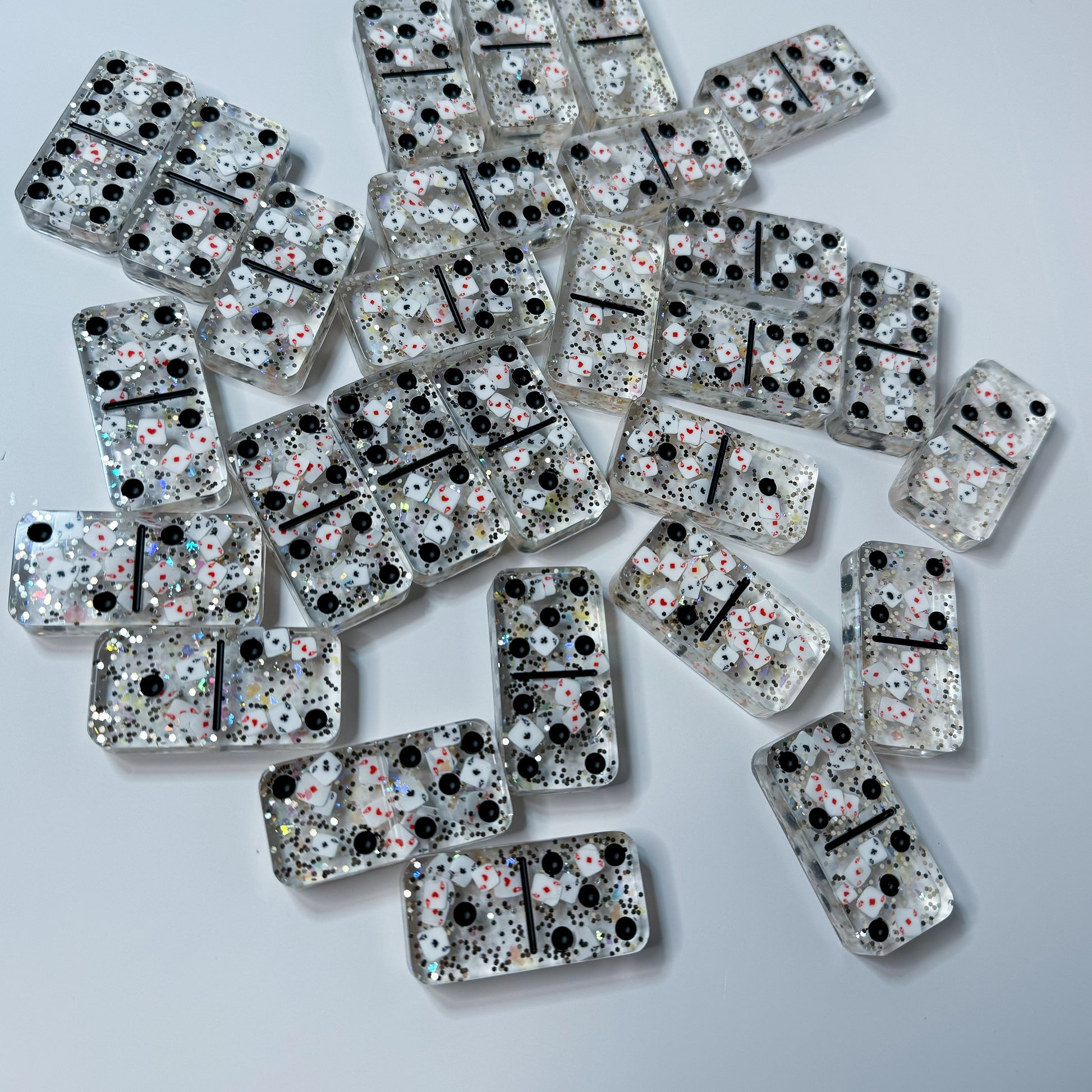 Clear Dominos with gold glitter, tiny Aces Cards, black dots. A resin domino set combines functionality with aesthetic appeal, providing both the tools for gameplay and a visually pleasing addition to any space.