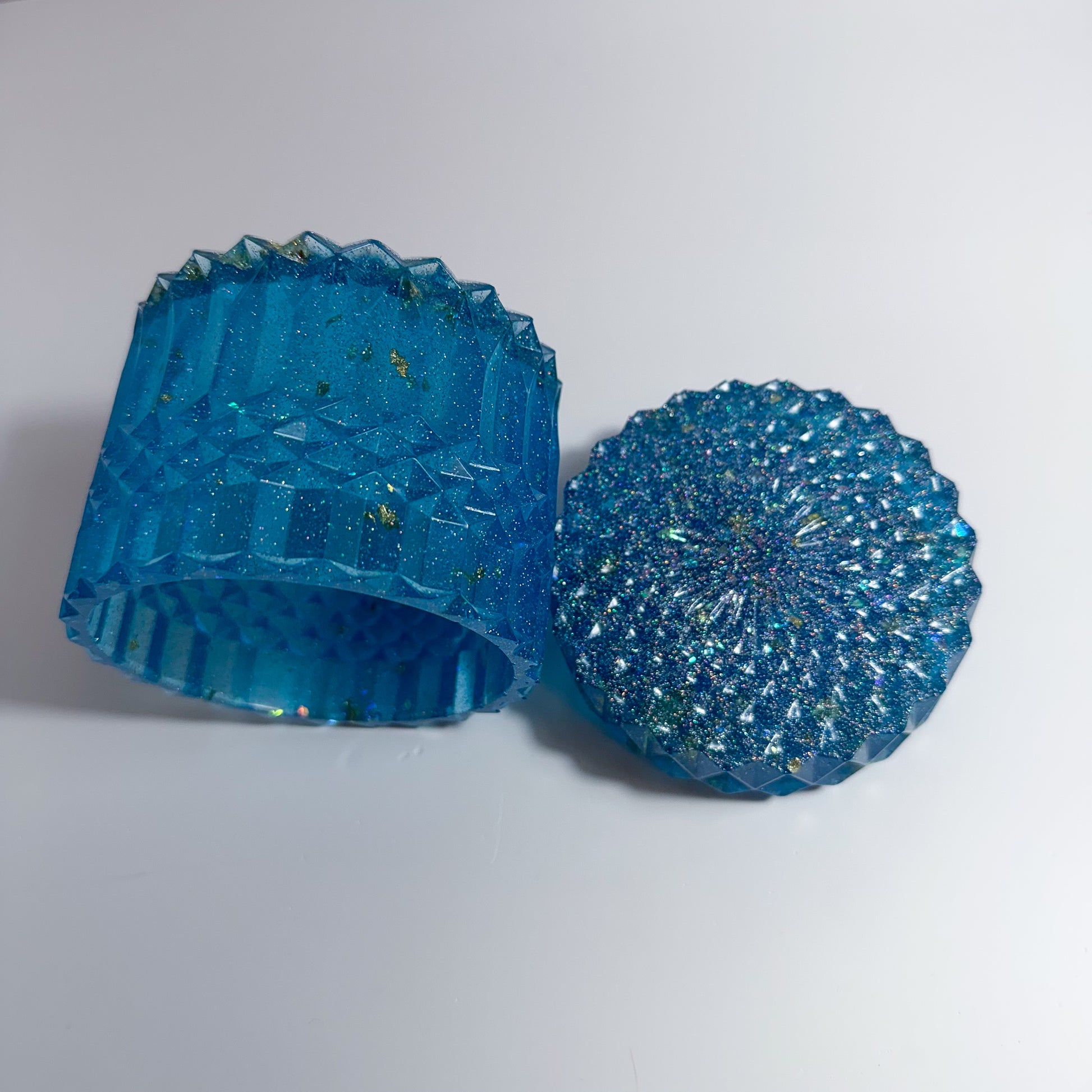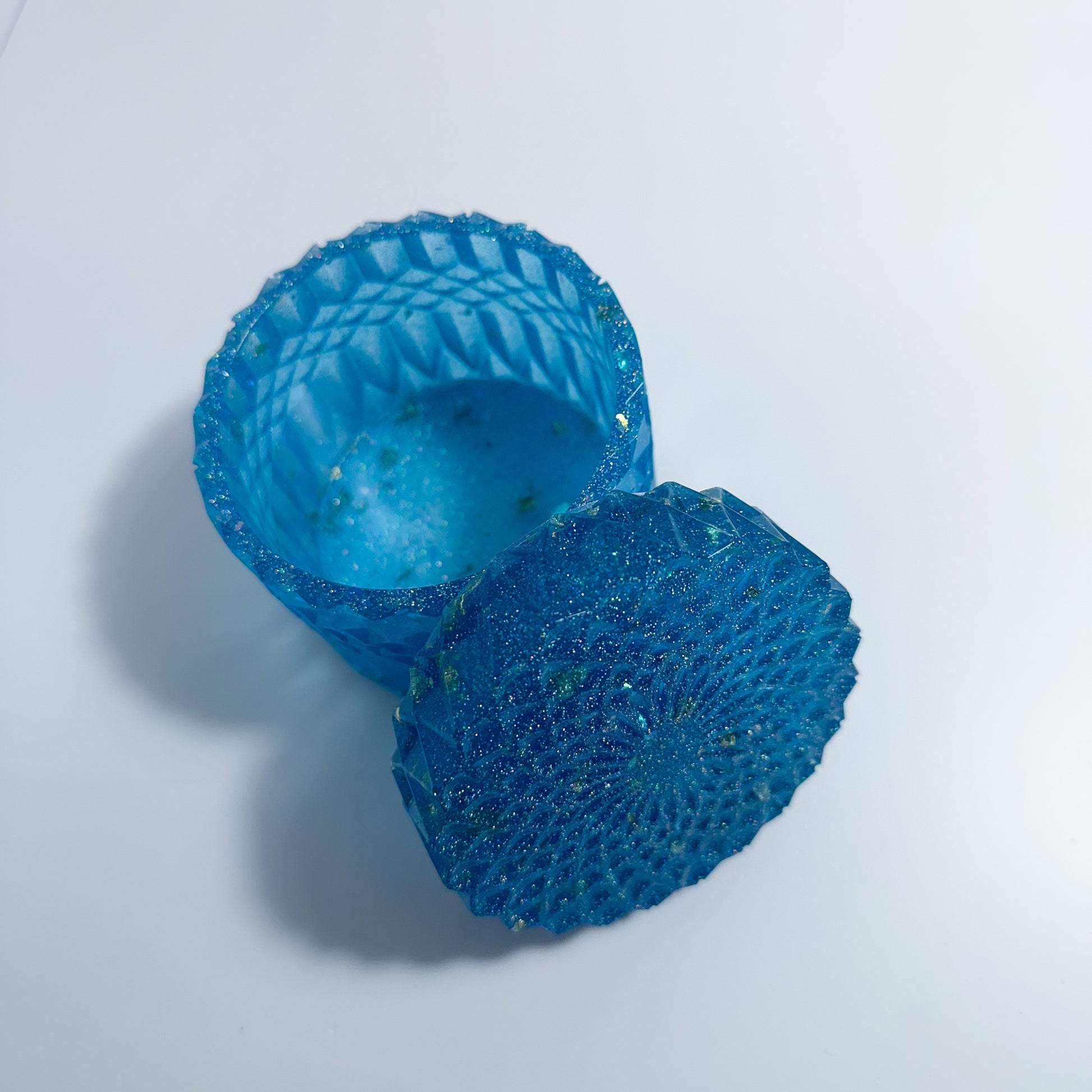 This small handcrafted resin container features a soft ripple texture and a darker blue and glitter finish. Perfect for holding jewelry, trinkets, or tiny essentials, it adds a subtle pop of color and refined charm to any space. Each piece is one of a kind.