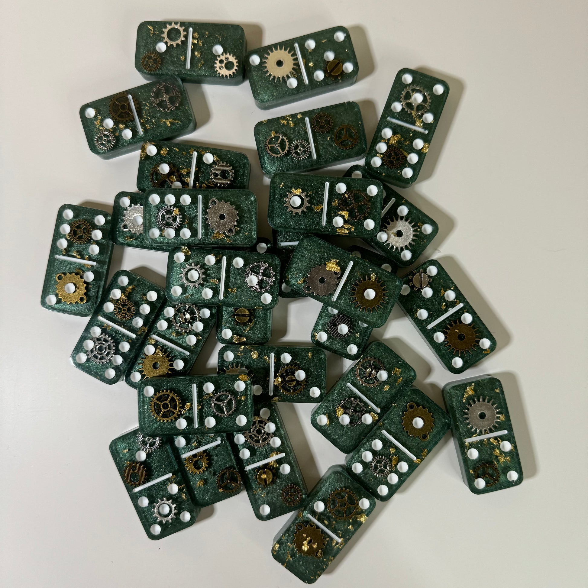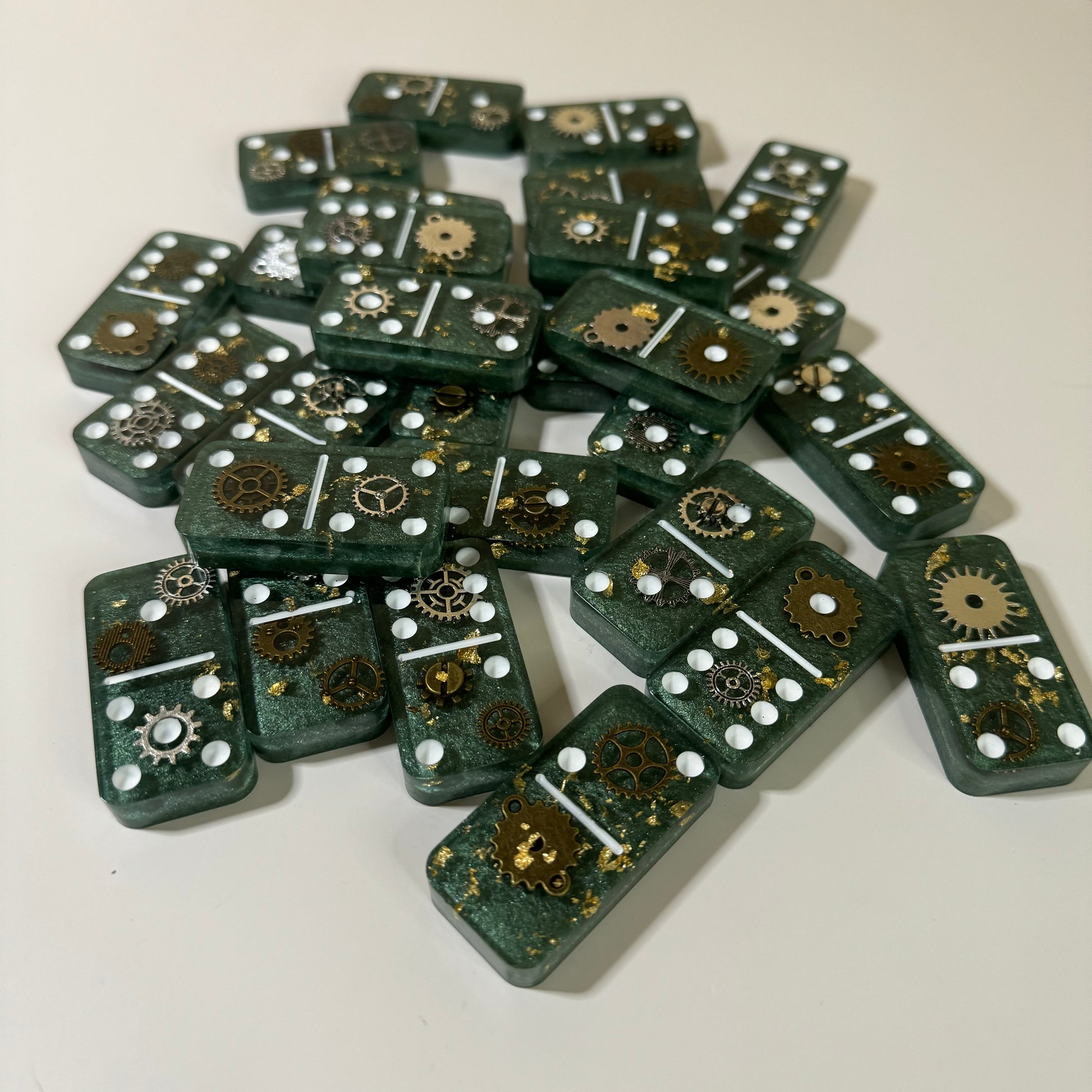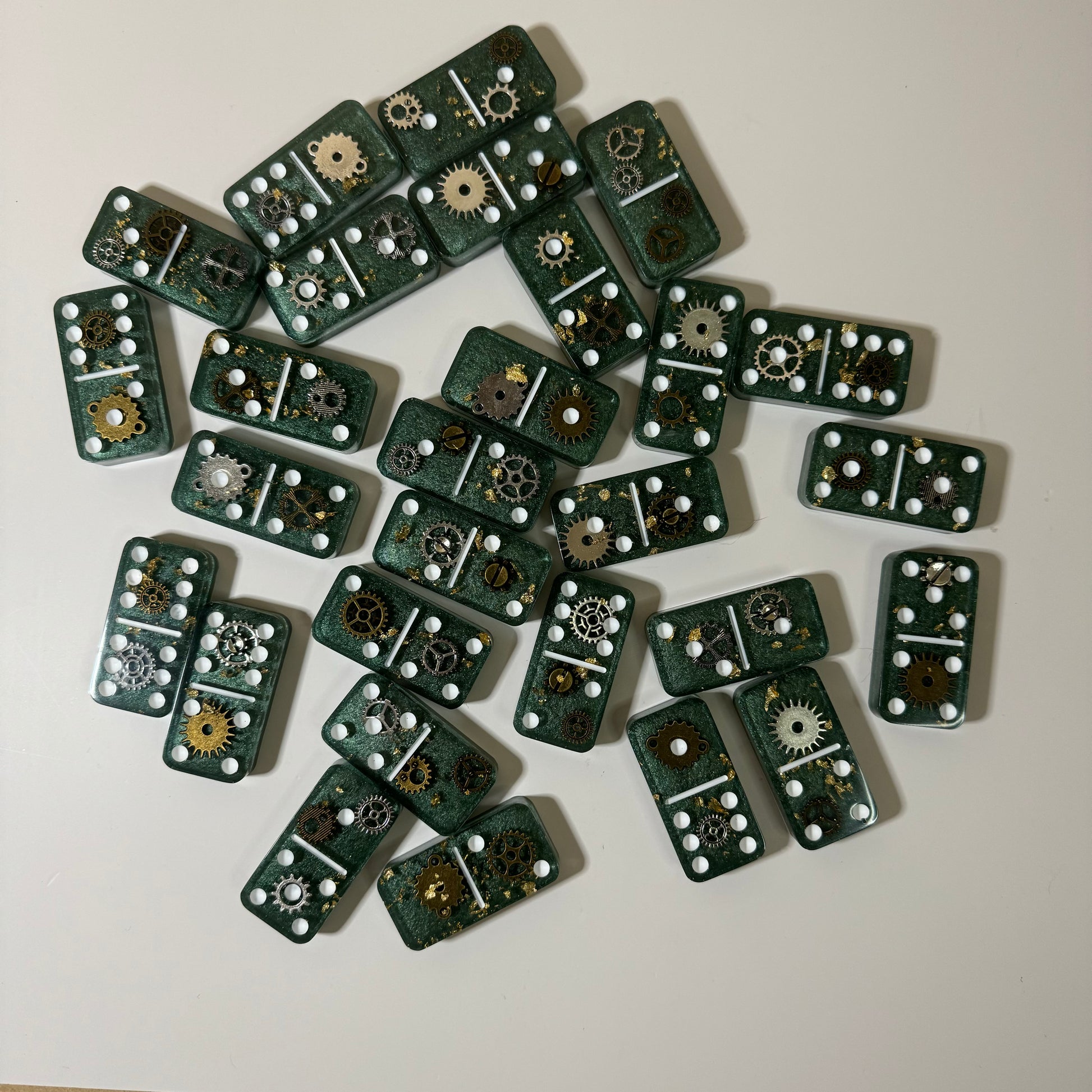 Clock gear, golden flakes and dark green background with White dots. A resin domino set combines functionality with aesthetic appeal, providing both the tools for gameplay and a visually pleasing addition to any space.