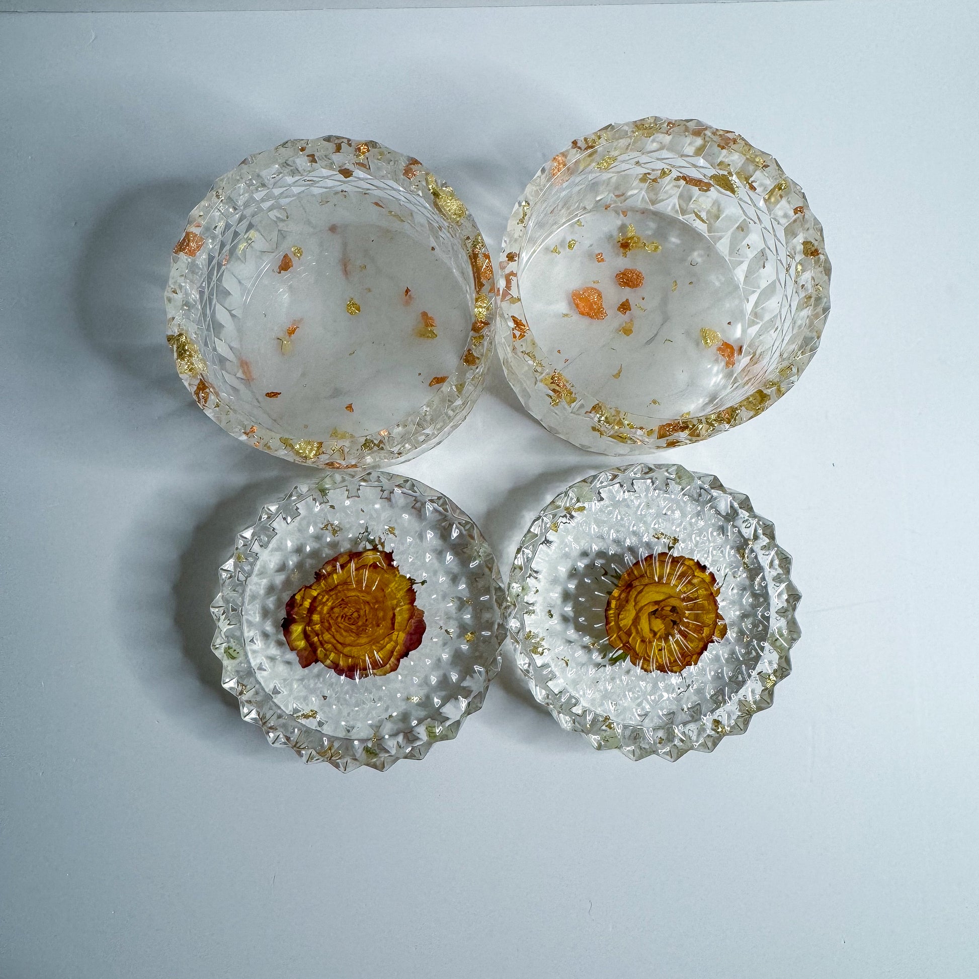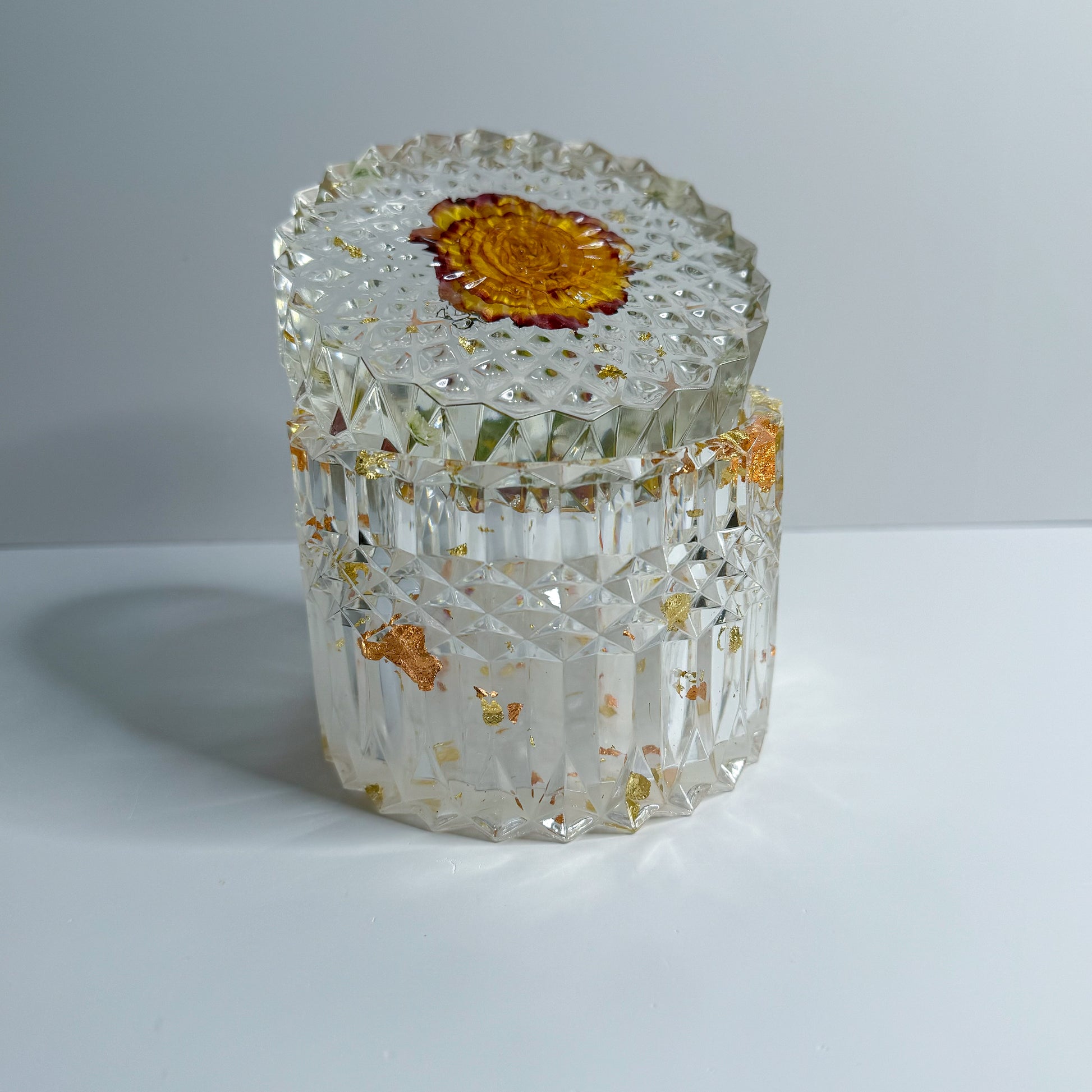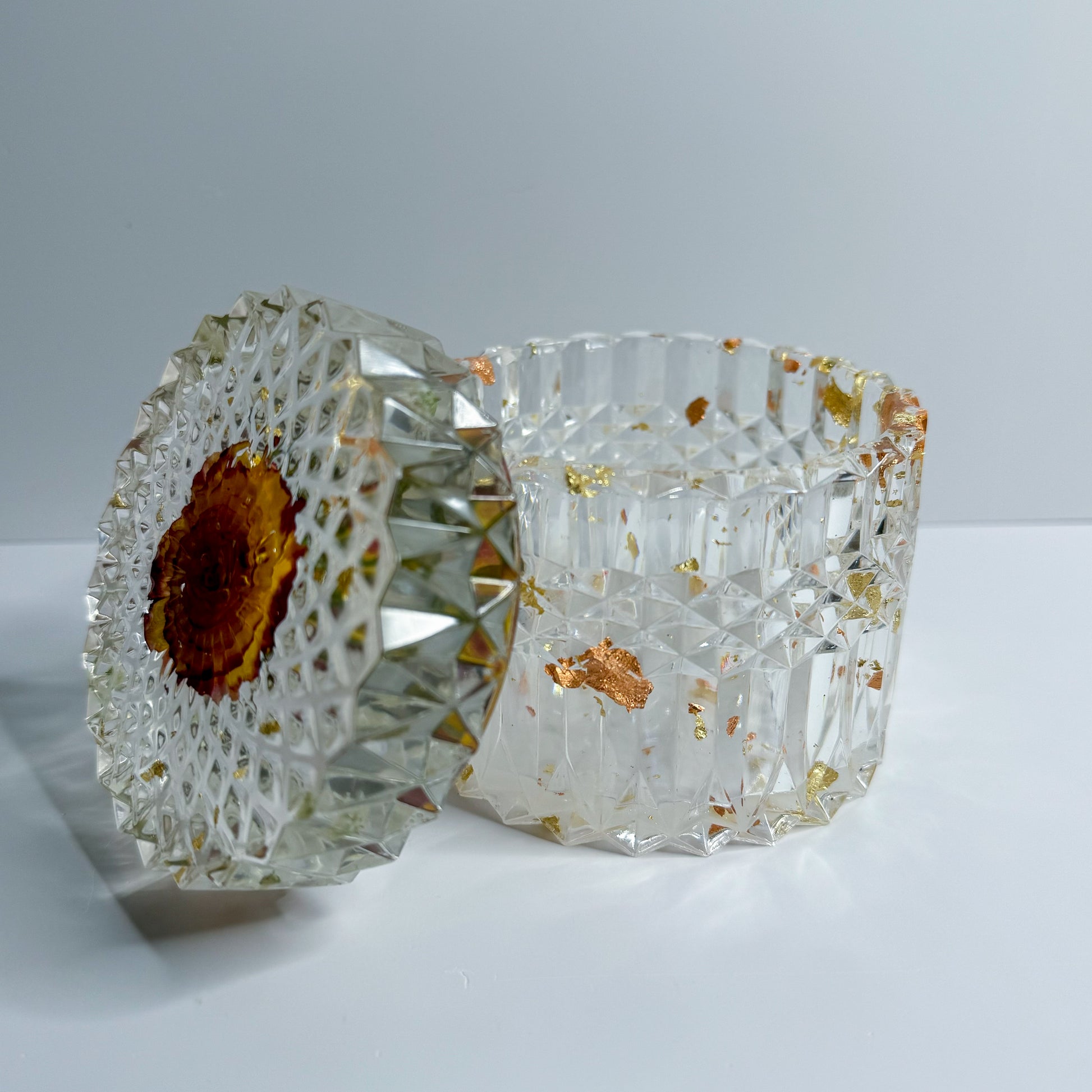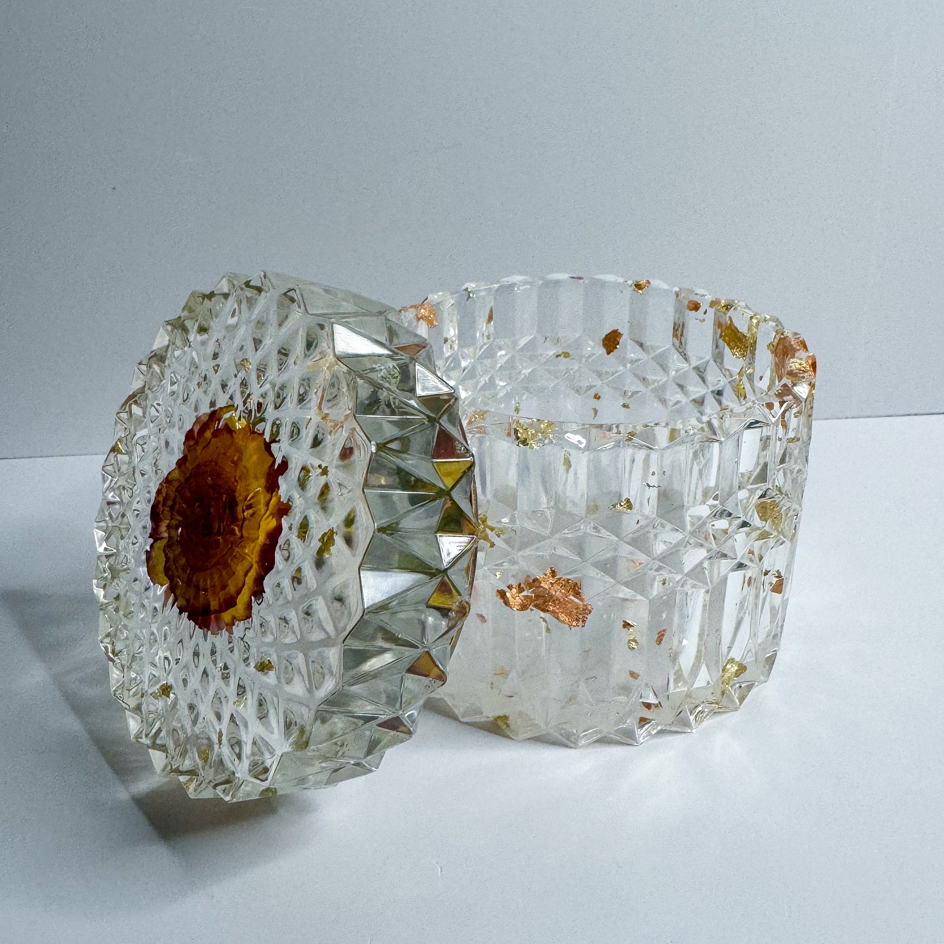 Crystal Clear containers with a Golden Rose on top. The crystal clear aspect makes them look so delicate and shiny. Crystal clear container of 4 inches tall container with the lid included. Will elevate your garden containers, can pair it with complementary plants, and many other items. Will help with storage to organize small items, or display products.