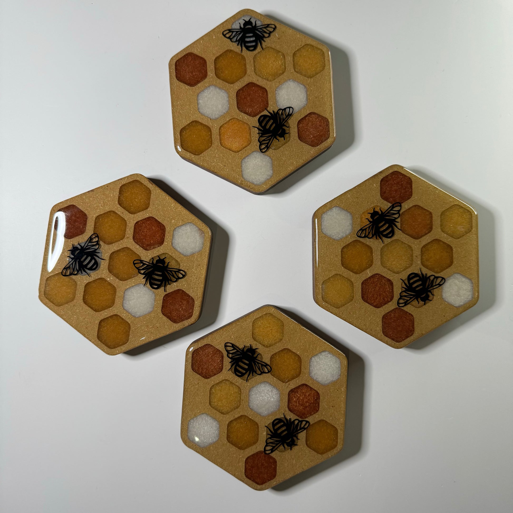 Honey comb coasters, honey colors, Honey bee stickers and Brown on the back. A set of four wood coasters with resin combines natural beauty with functional design to protect your surfaces in style. Crafted from high-quality wood, each coaster features a smooth, polished surface that adds warmth and sophistication to any table setting. The addition of resin not only enhances durability but also introduces a touch of artistic flair, as it can be customized with captivating colors, swirls, or even embedded objects like flowers or glitter. These coasters are not just practical accessories; they're elegant pieces of decor that elevate your home while keeping your furniture safe from unsightly water rings and heat damage.