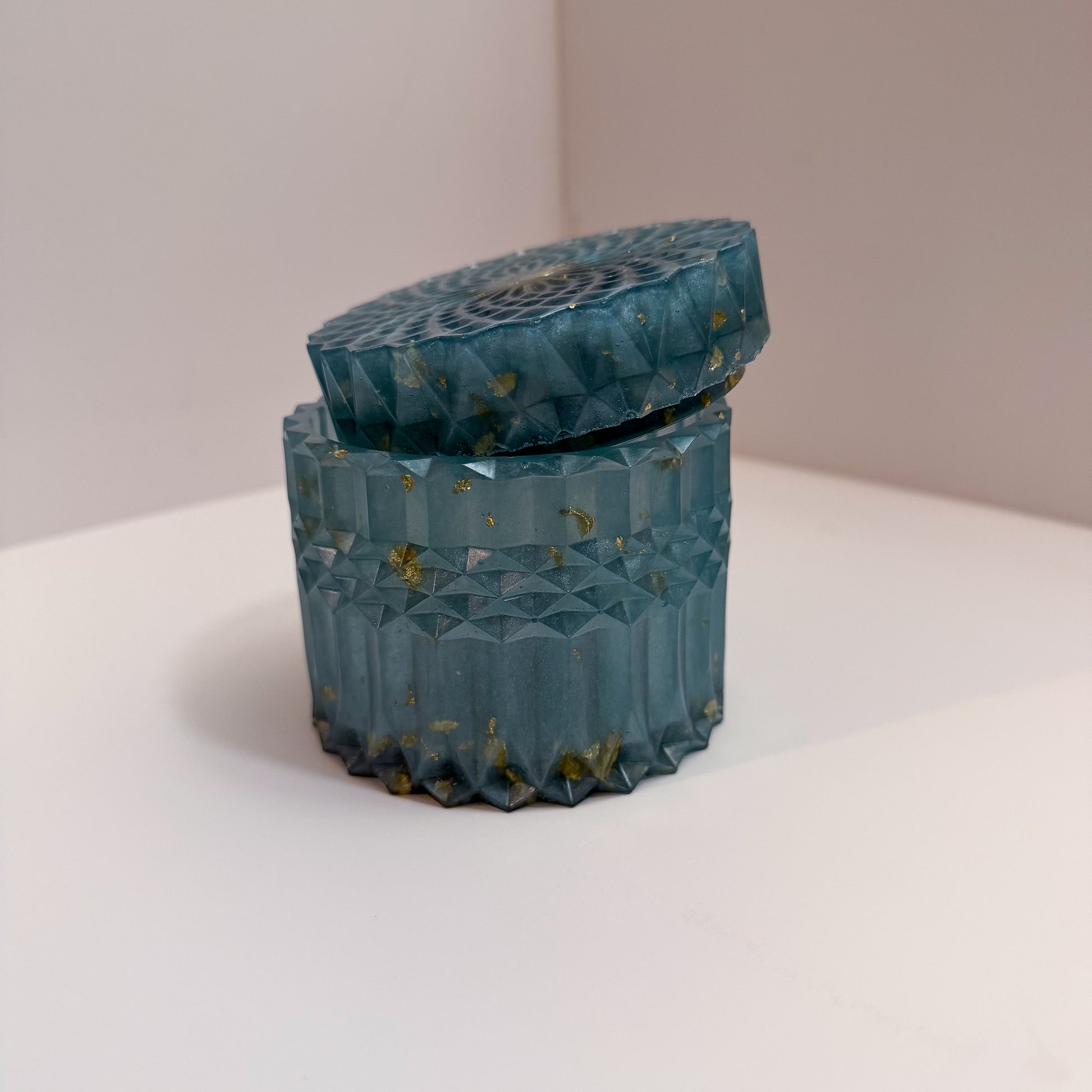 This small handcrafted resin container features a soft ripple texture and a smooth Light blue and golden flakes finish. Perfect for holding jewelry, trinkets, or tiny essentials, it adds a subtle pop of color and refined charm to any space. Each piece is one of a kind.