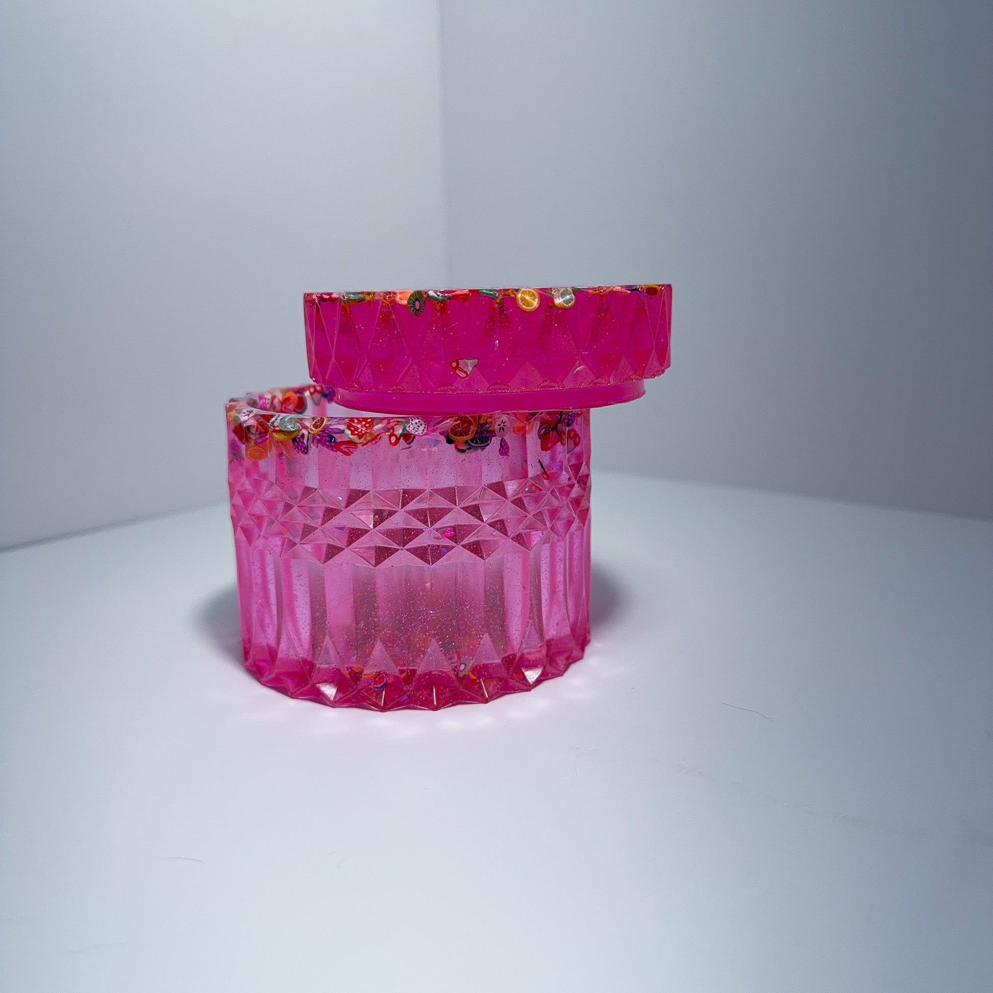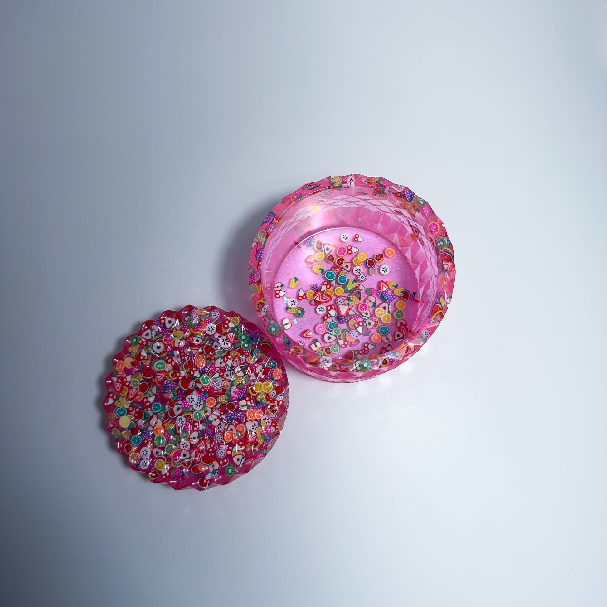 This small handcrafted resin container features a soft ripple texture and a smooth pick resin with tiny fruits and glitter finish. Perfect for holding jewelry, trinkets, or tiny essentials, it adds a subtle pop of color and refined charm to any space. Each piece is one of a kind.