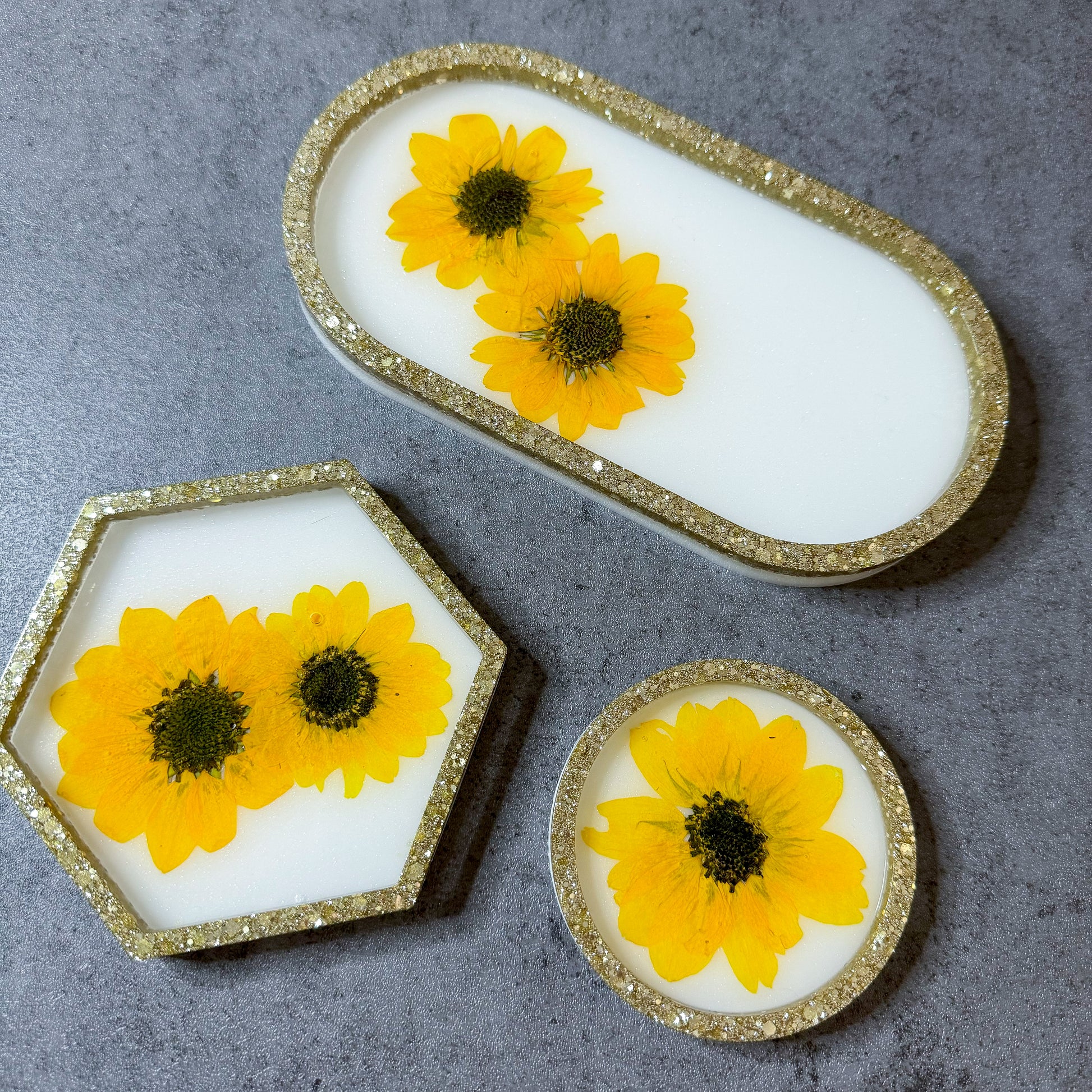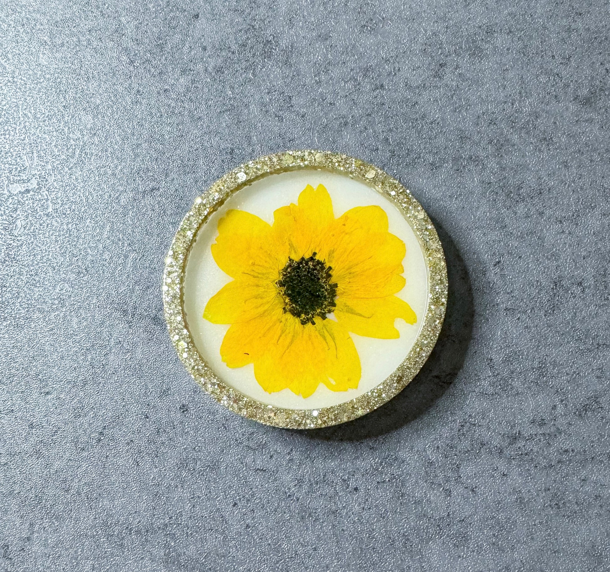 Mini circular tray with golden edges, white background with a sunflower. Typically serve as storage or display solutions for various types of jewelry, like rings, earrings, bracelets, and necklaces. They often feature compartments or slots designed to keep each piece organized and prevent tangling or damage. Some trays have padded inserts or velvet linings to protect delicate items, while others incorporate transparent lids for easy visibility.