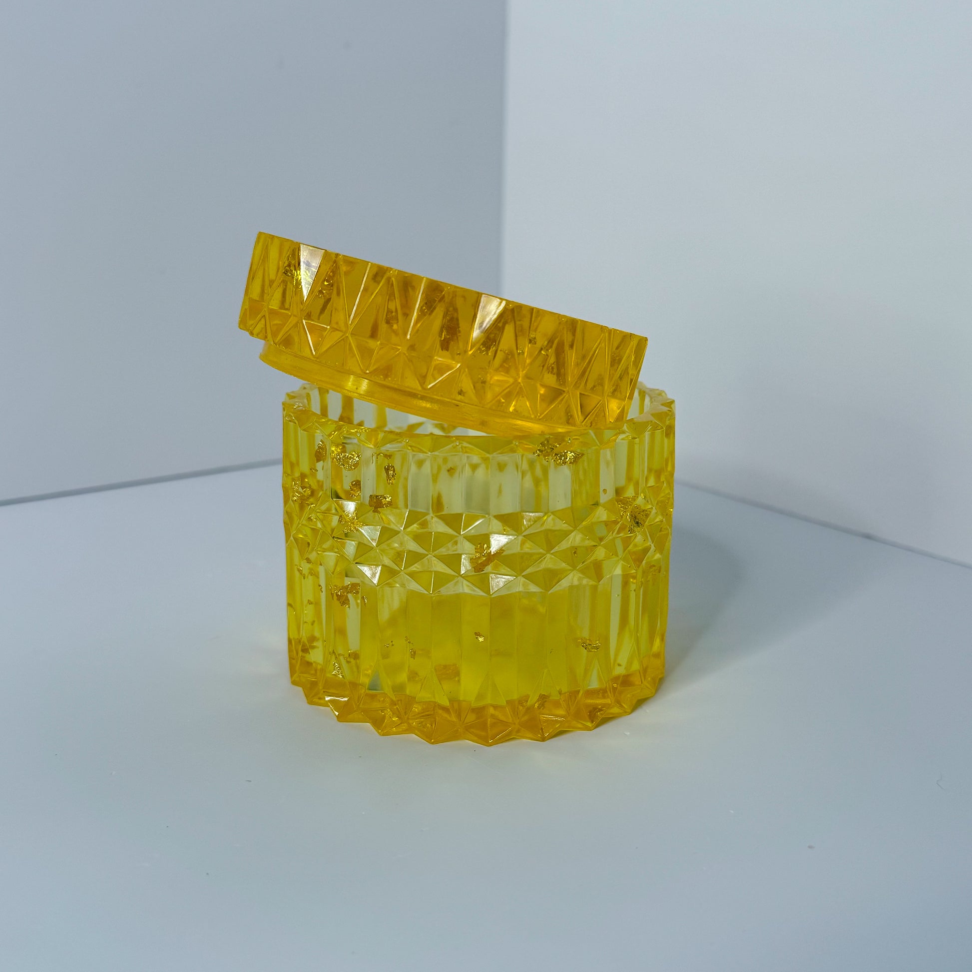 Yellow and Gold flakes container of 4 inches tall container with the lid included. Will elevate your garden containers, can pair it with complementary plants, and many other items. Will help with storage to organize small items, or display products.